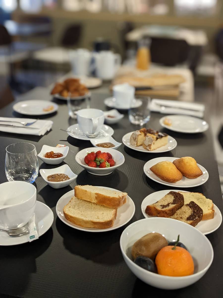 Ouvert à tous, notre service de petit déjeuner propose une sélection généreuse de produits frais et de qualité : mini viennoiseries, pains variés, jus de fruits, boissons chaudes, fromages, charcuterie, œufs brouillés, bacon, et de nombreux gâteaux fait maison.